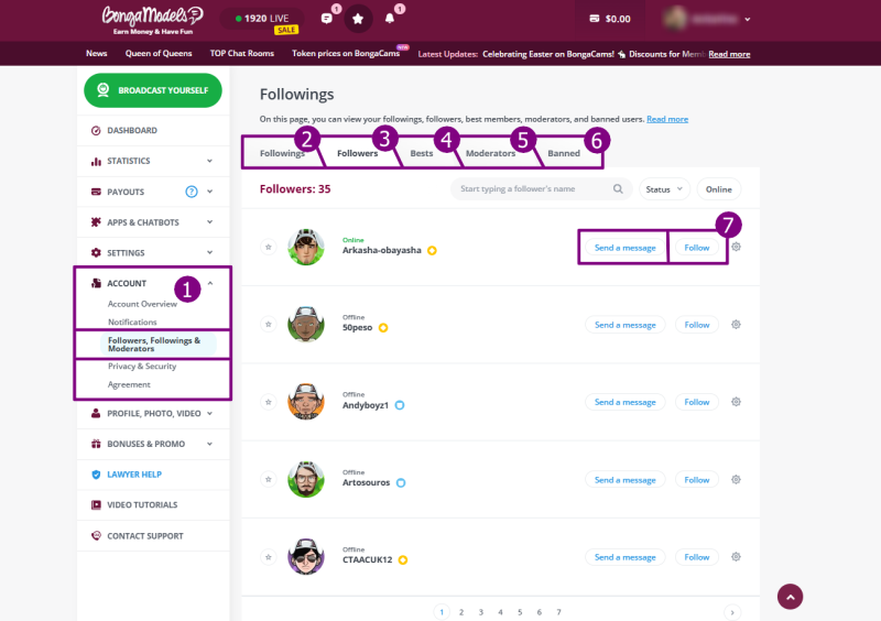 - Мессенджер - В этом разделе вы можете общаться со своими поклонниками. Отображаются последние четыре диалоговых окна.