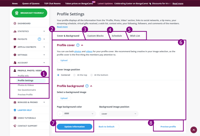 9. Settings - Технические настройки в профиле. Самая важная из них - географический блок страны, в которой вы не хотите отображаться.
