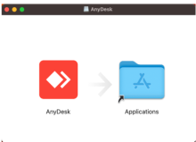 - После установки и запуска файла, появится окно в котором находится значок Anydesk и папка Applications. Перенесите значок Anydesk в папку Applications — для этого кликните по значку левой кнопкой мыши, удерживайте кнопку и перетащите в папку.