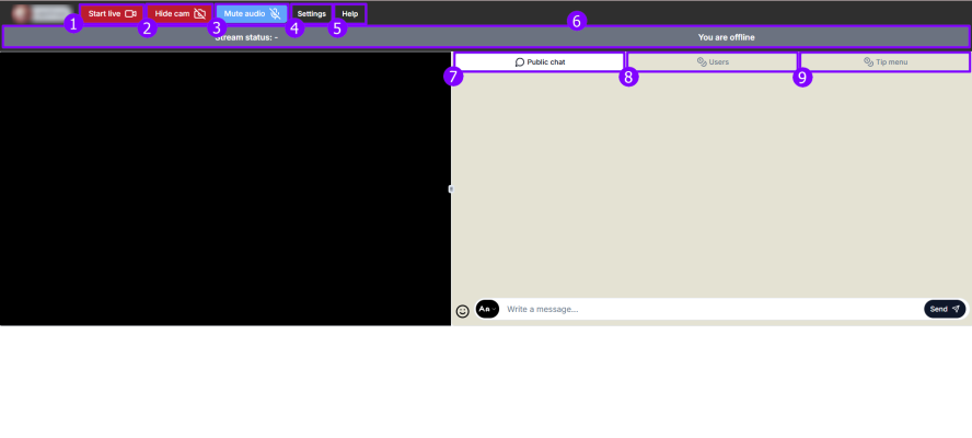 6. Stream status - Статус вашей трансляции, показывает находитесь ли вы в сети.