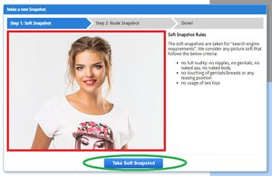 Далее ваша камера активируется, и сайт запросит сделать “Soft Snapshot”. Это скромное профильное фото для рекламы вашего аккаунта на сайте. Данное фото необходимо делать максимально скромным, а именно: без какой-либо обнаженности или наготы, без сексуальных поз, в скромной одежде (блуза или футболка под шею), даже без декольте. После того как вы подготовились, нажимаем “Take Soft Snapshot” и сайт делает фото. (есть таймер несколько секунд, чтобы вы успели принять удобную позу).