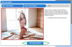Следующий шаг “Nude Snapshot” - это также ваше профильное фото, но более эротического содержания, желательно чтобы оно было игривым. Его делаете уже на собственное усмотрение. На фото можно быть в нижнем белье или вовсе без него, с глубоким декольте и в любых откровенных нарядах, принимать любую позу на ваше усмотрение. Если вы работаете в категории "общение", данное фото вы также можете сделать скромным по своему желанию.