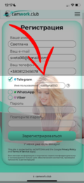 Переходим на страницу регистрации Camwork.club и вставляем скопированный Telegram-логин в соответствующее поле.