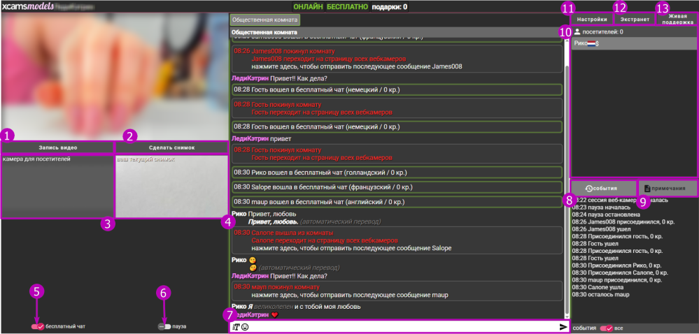 8. События - тут отображаются события вашего чата, заход и выход пользователей, режимы чата и т.д.