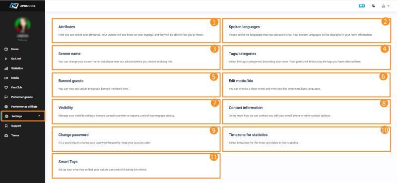 12. Rates - Установите цены на ваши приватные шоу. Рекомендуем не завышать их, чтобы не повлиять на посещаемость вашей комнаты.
