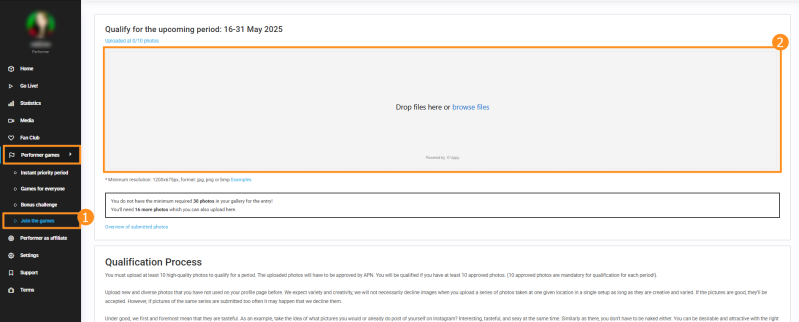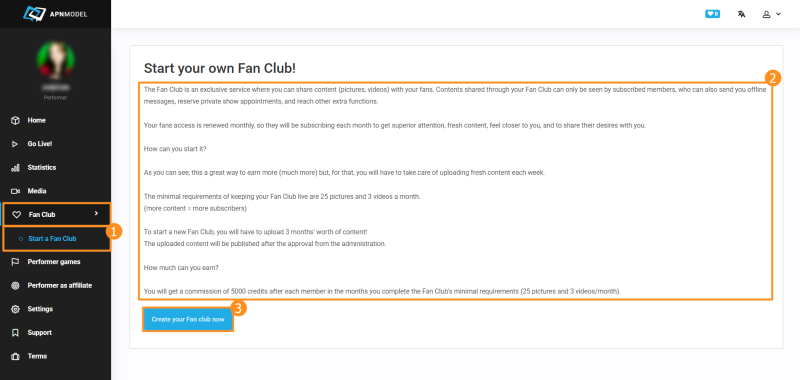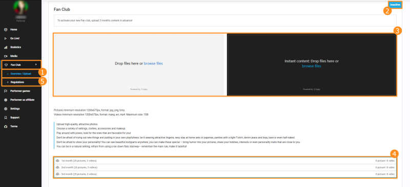 - Для успешной активации необходимо загрузить 75 фото и 9 видео, а также ежемесячно добавлять по 25 фото и 3 видео. Только в этом случае ваш фан-клуб будет считаться активным, и вам будут начисляться средства.