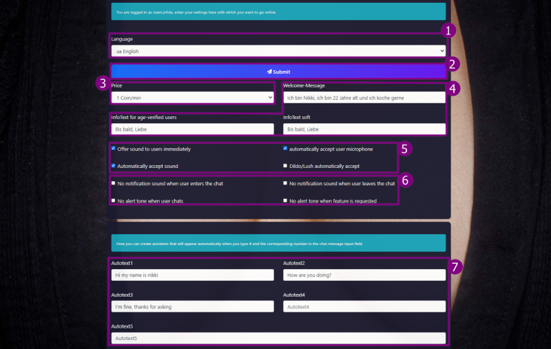- Автопринятие Cam2Cam - Пользователь сможет включить свою камеру. Цена: 2 Coin/min.