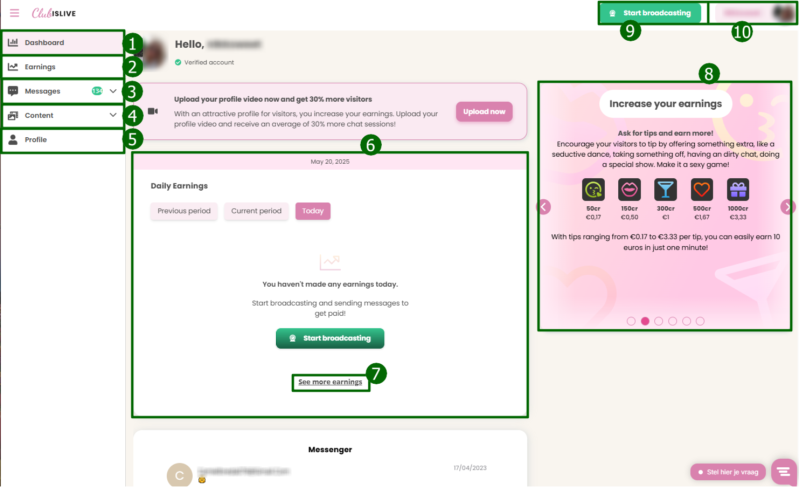 - Заработок отображается в евро, без вычета комиссии Camwork.